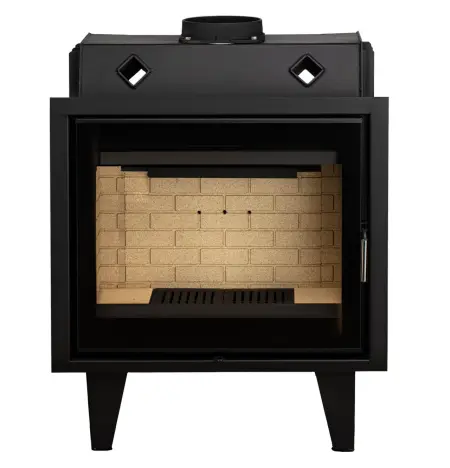 Каминная топка увеличенного объема вмещает поленья длиной до 55 см, которые сгорают до состояния пепла благодаря встроенной системе двойного дожига. Эта функция не только помогает экономить топливо, но и существенно повышает КПД прибора, доводя его до 75%.