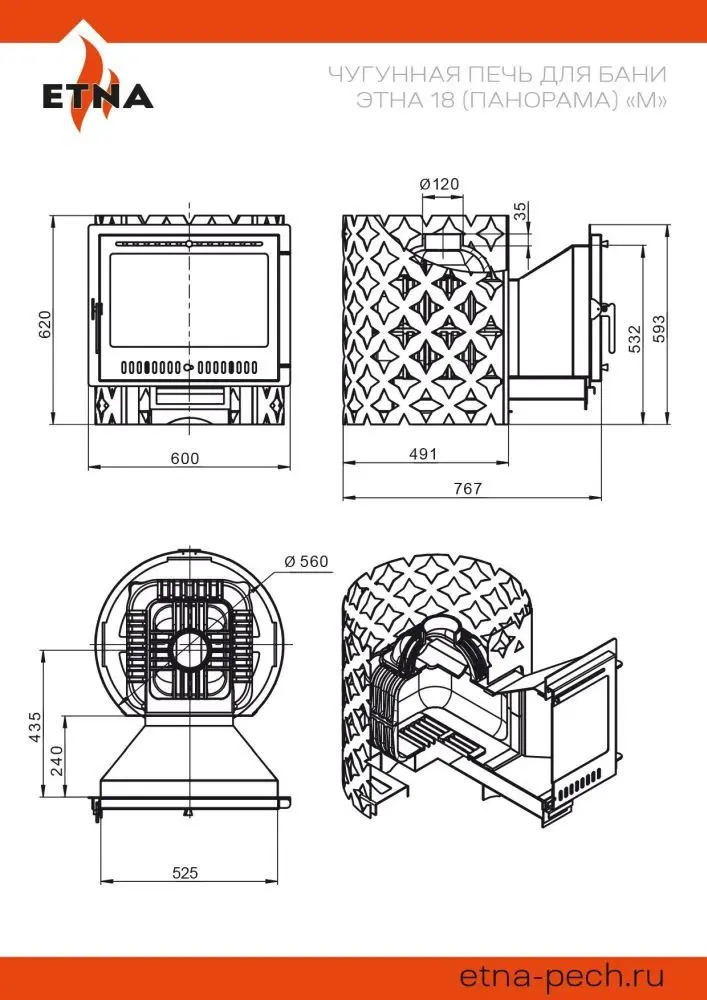 Чугунная банная печь ЭТНА 18 Панорама М оснащается стальной дверкой артикул Панорама М. Печь рассчитана на обогрев парной объёмом до 18 кубических метров. С помощью этой модели обеспечивается быстрый равномерный прогрев парной, поддержание необходимой температуры и получение достаточного количества пара. Дверка панорамная, горизонтального размещения, оснащена створкой с термостойким стеклом из керамического сплава. Ручка двери при закрывании плотно притягивает полотно дверки к рамке, что предотвращает попадание дыма и горящих газов в помещение. Банная печь ЭТНА 18 Панорама М изготовлена из качественного чугуна. Чугун быстро передаёт энергию сжигаемого топлива наружу, в пространство парилки. Толщина деталей корпуса составляет 6-8 миллиметров.