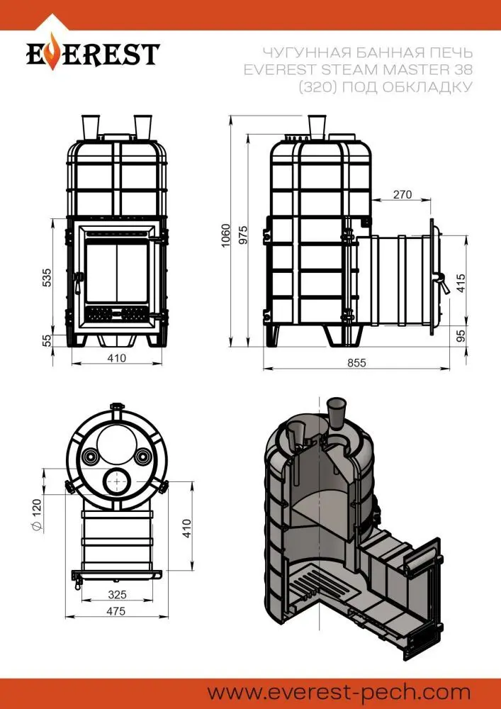 Банная печь Эверест "Steam Master" 38 (320) ЧУГУН (под обкладку) предназначена для нагрева помещений и получения пара в парных объёмом до 38 кубических метров.