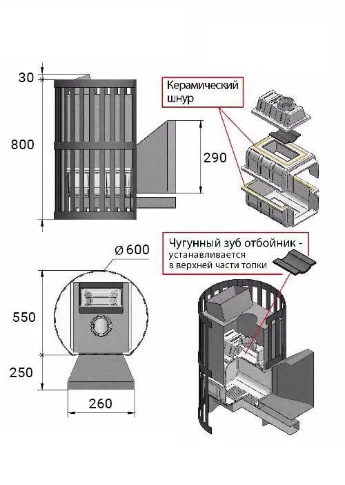 В конструкции данной печи предусмотрен топочный тоннель, при помощи которого печь топится из соседнего помещения, смежного с парильным.