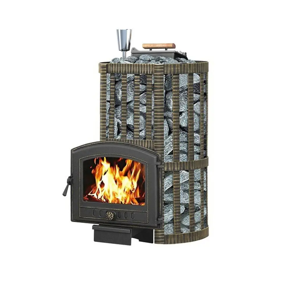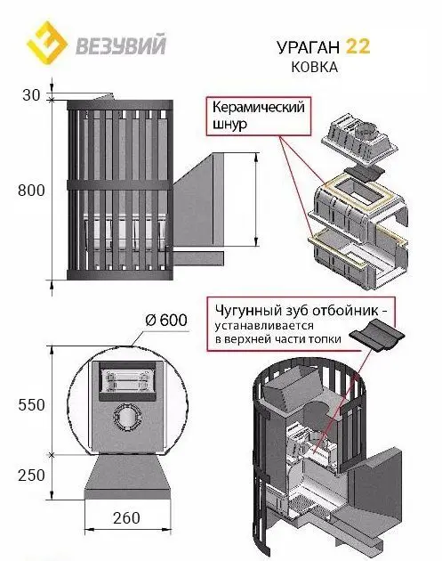 Банная чугунная печь Ураган Ковка 22 (224) укомплектована чугунной герметичной дверцей Везувий 224 с жаропрочным стеклом «SCHOTT ROBAX». Закрытая каменка изготовлена из стали и вмещает в себя не менее 60 кг камней. Конвекционно-вентилируемый кожух "Ковка" изготовлен из металлической текстурированной полосы покрашенной термостойкой краской и покрытая патиной «Бронза».