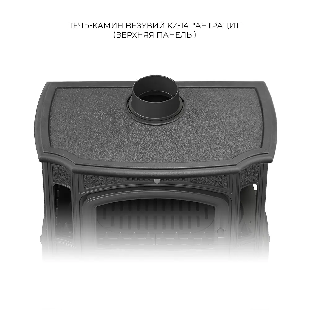 Печь-камин Везувий KZ-14SР "Антрацит" изготовлена из качественного чугуна с толщиной стенки 8-10 мм. Модель рассчитана на обогрев помещений объёмом до 280 м³.Топочная камера с двойными чугунными стенками. В нижней панели предусмотрена колосниковая решётка. Дверь изготовлена из чугуна и оснащена большим панорамным стеклом в виде арки. С двух сторон от двери установлены две стеклянные вставки. На модели KZ-14Р по бокам установлены стекла. Чистота стекла во время работы обеспечивается системой подачи воздуха на внутреннюю сторону стекла. Воздух отсекает дымовые газы и пламя от поверхности стекла, предотвращая закопчение и потемнение стекла. На моделях KZ-14 , KZ-14S ручка управления системой размещена в верхней части передней панели, над дверью у KZ-14Р с боку над стеклом. В нижней части двери размещена ручка задвижки для подачи воздуха на первичное горение