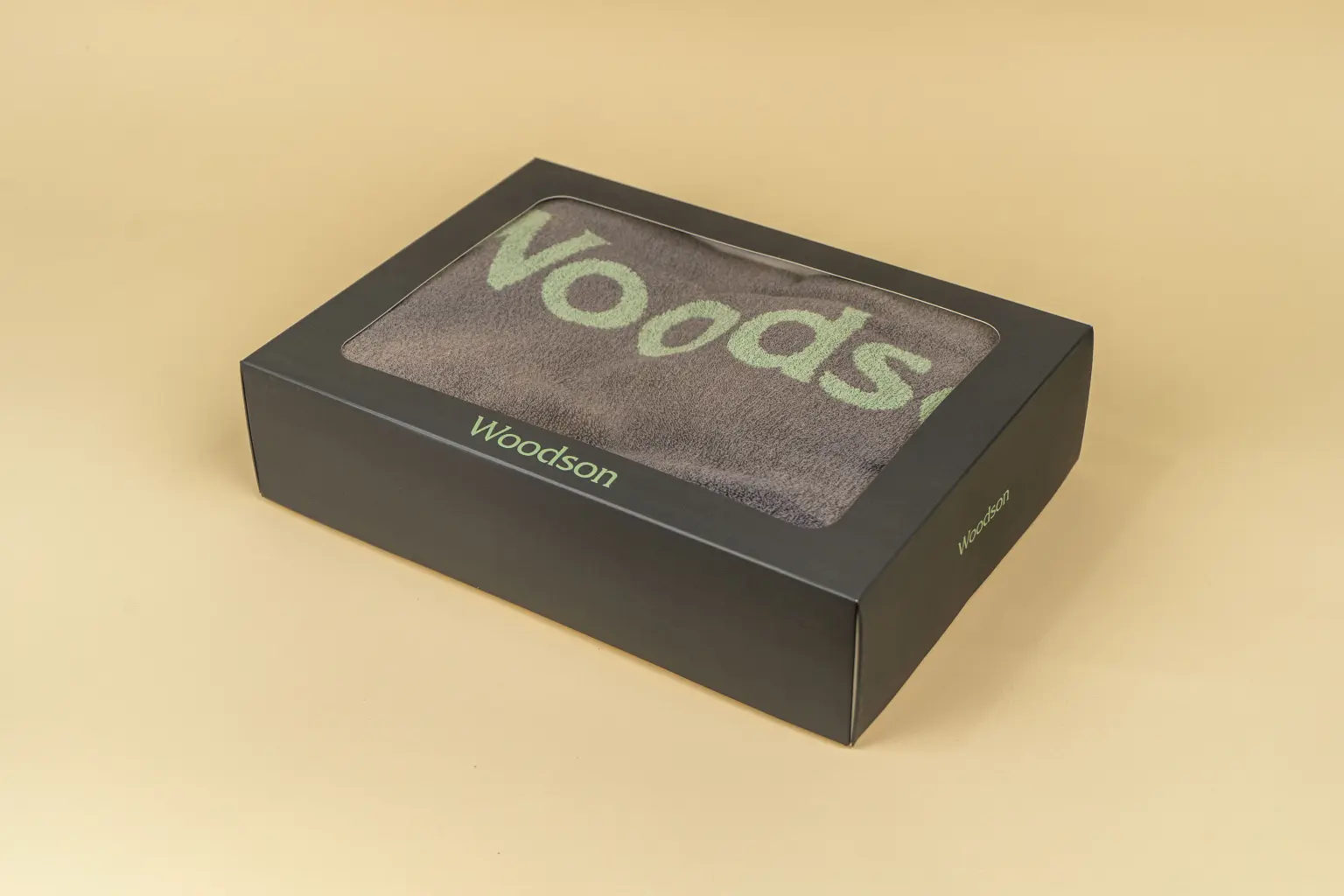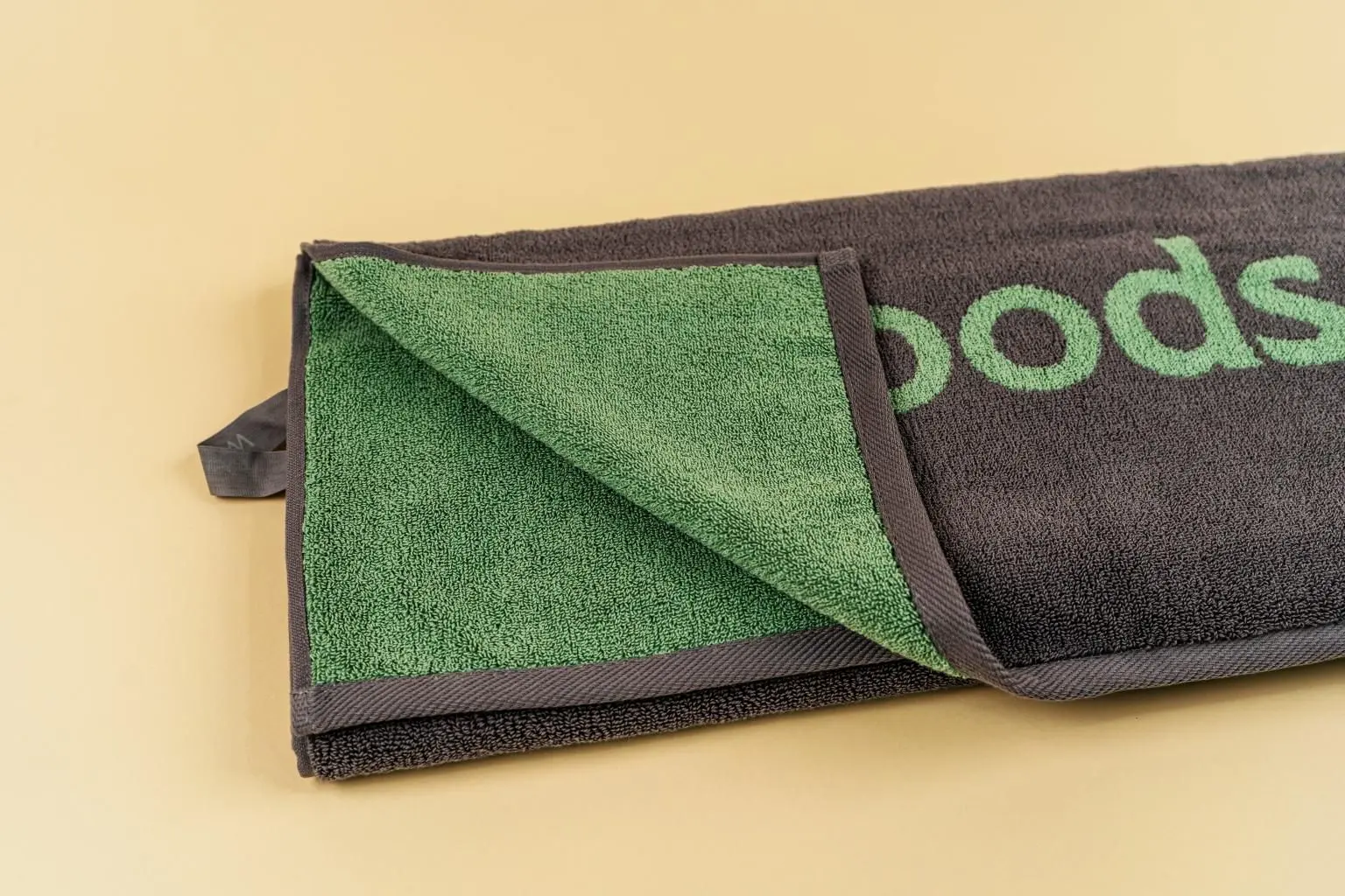 Полотенце махровое размером 70*140 см с логотипом Woodson выполнено в цветовой гамме серый/светло-зелёный.
